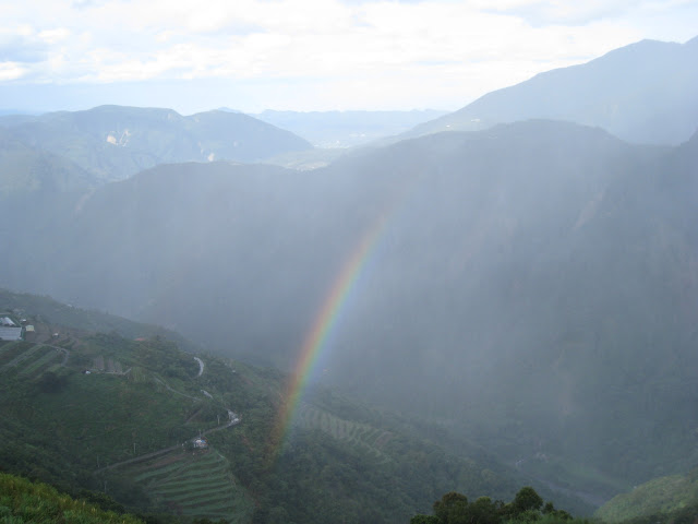 06:00,醒了。心裏想可否有機會看到日出呢?於是便拿著相機急步走到露台,雨仍沒有停,只不過是沒有那麼大而已。 輕飄飄的一陣一陣的下著。雨隨著微風送到臉上,鼻孔吸著高山清涼空氣使倦意全消。突然出現驟雨中的陽光,一道彩虹就在眼前出現,她跟1733的距離就像觸手可及一樣。