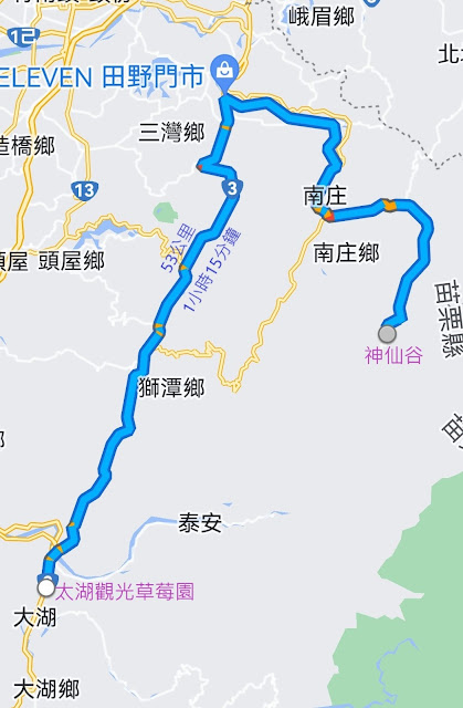 實際行程:(苗栗縣)[南庄鄉]星宿景觀咖啡民宿 → 蓬萊溪生態園區護魚步道[來回步行1小時30分鐘] → 南庄老街(乃木圾)[8公里/15分鐘] → 向天湖[9公里/25分鐘] → 神仙谷[15公里/30分鐘] → [大湖鄉]太湖觀光草莓園(採草莓)[53公里/1小時15分鐘] → 大湖草莓文化館[2公里/5分鐘] → 雪霸國家公園汶水遊客中心[3公里/5分鐘] → (台中市)[南區]忠孝路夜市(晚餐)[56公里/1小時35分鐘] → [北屯區]華登商務飯店[7公里/25分鐘]。
